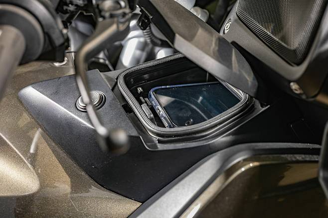핸들 아래 양쪽에 수납공간이 마련되어 있는데 우측에는 휴대폰 무선 충전 시스템이 탑재되어 있다. 휴대폰을 넣고 원터치방식으로 고정할 수 있으며 다시 꺼낼 때 유용한 스트랩도 마련되어 있다. 게다가 휴대폰이 무선 충전으로 인해 가열되는 것을 방지하려고 냉각팬이 함께 식혀주도록 설계했다. 순정 사이드 케이스가 기본 적용되는데 헬멧을 넣고도 각종 소지품을 추가로 보관할 수 있을 정도로 넉넉한 수준이며 열고 닫히는 방식의 완성도가 매우 좋다. 또한 글러브박스와 양쪽 사이드 케이스를 한 번에 잠글 수 있는 센트럴락 버튼도 편리하다.