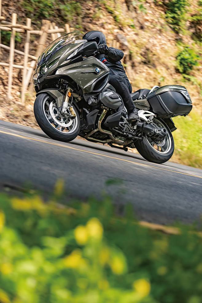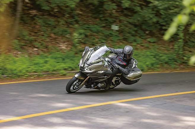 스로틀에 따른 엔진 반응이 날렵해지고 1단 기어에서 풀 가속하면 프런트가 서서히 떠오른다. 이내 DTC가 개입하며 프런트를 내려놓지만 강한 가속을 방해하지 않으면서 프런트가 과하게 들리는 것을 방지해 라이더의 의도대로 빠르게 나아가는 느낌이다. 퀵시프트를 통해 풀 스로틀을 이어가다 보면 계기반에 당황스러운 속도를 표시한다. 보통 대형 투어러로 내달리다 보면 모터바이크 자체가 지닌 묵직한 질량이 부담스러워질 때가 있다. 마치 대형 트럭으로 달리고 있는 느낌이라 제동이 걱정된다. 하지만 RT는 프런트 브레이크 레버를 당기는 순간 전후 연동 브레이크 시스템이 작동하며 매우 빠르고 안정적으로 제동한다. 차량 중량이 타이어를 누르는 양과 브레이크 성능, 슬립을 방지하는 전자장치, 전자식 서스펜션의 조화가 완벽하다. 따라서 과감하게 달리다가도 코너 진입 전에 내가 원하는 속도까지 정확하게 제동할 수 있다.