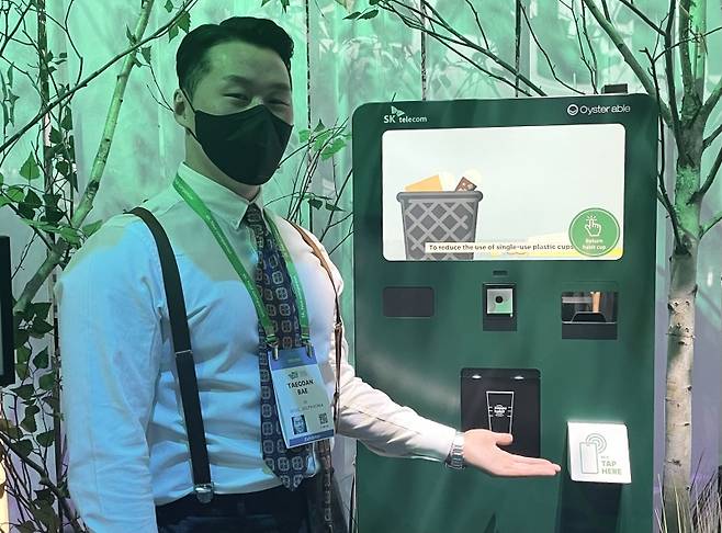 CES는 이번이 처음이라고 합니다. 친환경을 내건 SK그룹 부스 내에서 오이스터에이블을 만날 수 있습니다. CES에서는 보증금을 ‘기부 형태’로 바꿔 반납 건마다 기부금이 쌓이는 기분 좋은 홍보를 진행했습니다.