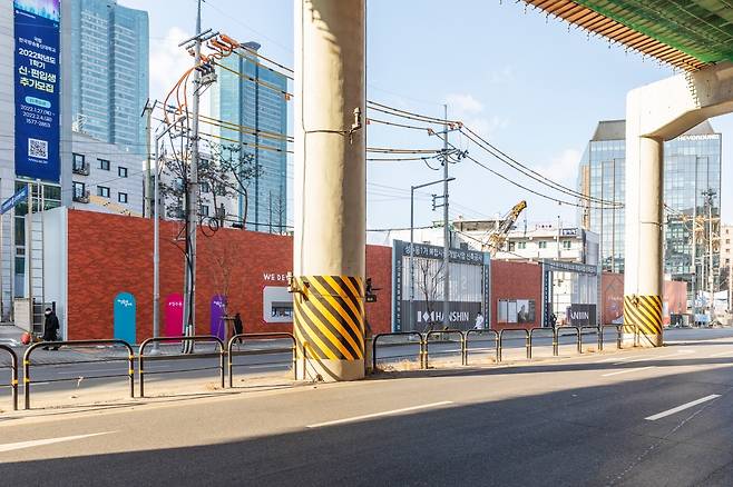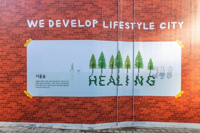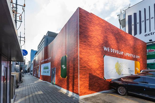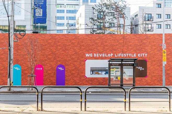 다들 기억하는지 모르겠지만 얼마 전까지만 해도 이 자리에 멋도 없고, 색깔도 없는 공사장 가림막이 큼직하게 들어서 있었다. 뚝섬역 사거리에서 서울숲역 방향으로 모퉁이를 돌 때마다, 몇 번을 봤는지 모른다. “대체 언제까지 공사하는 거야…”라고 불평을 하기도 했다. 왜냐면 여기가 상당히 눈에 띄는 자리다. 유동인구도 많고, 핫플도 밀집돼 있다. 지하철을 타고 지나가며 한눈에 내다보이는 자리이기도 하다. 건너편에는 아름다운 빨간 벽돌 빌딩의 ‘블루 보틀’ 건물이 있고, 모퉁이를 돌면 내가 성수동에서 제일 좋아하는 와인바인 ‘미도림’이 나온다. 이렇게 발길이 자주 닿는 곳에 답답한 가림막이 드리운 채, 도시의 모든 색채를 먹어버리고 있다는 건 정말 서글픈 일이었다.