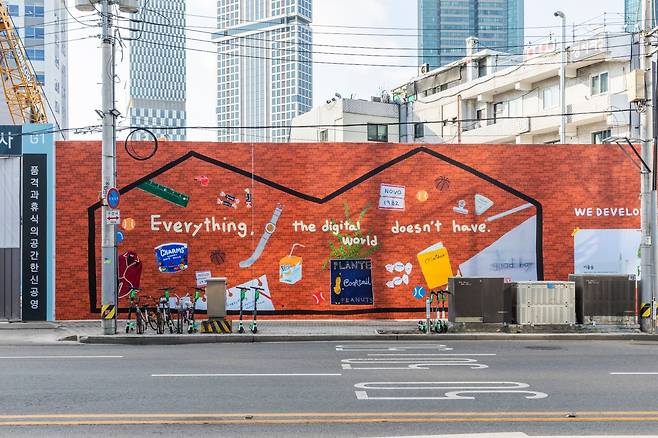 알고 보니 이 벽화는 네오밸류가 만든 도시문화 플랫폼 브랜드 ‘루프스테이션’ 프로젝트의 일환이었다. 공사 현장의 가림벽은 도시 미관을 해친다는 발상을 전환해 ‘아트월(Art wall)’로 탈바꿈하는 프로젝트다. 누군가에게는 공사장 가림막이지만, 다른 이에게는 새로운 이야기 방식이자 소통의 창구가 될 수 있지 않을까라는 상상력에서 시작됐다고 한다. 사실 요즘 소위 ‘뜬다’는 동네가 다 그렇겠지만, 하루가 멀다하고 새로운 건물이 올라가고 포크레인이 오토바이처럼 드나들며 공사가 멈추는 날이 없다. 피로하지 않다고 하면 거짓말이겠지. 어제까지만 해도 건물이 있던 자리를 허물어버린 걸 보면 어쩐지 기분이 묘하기도 하고 말이다. 그래서 이 아트월 프로젝트를 통해, 공사로 발생하는 소음과 먼지 같은 삭막한 풍경에 예술을 입히기로 마음먹은 것이다. 시공사 이름이 크게 새겨져 있기 일쑤인 공사장 가림막에 아름다운 작품을 그려 넣겠다는 기가 막힌 생각을 한 것이다. 오호, 재밌는데?