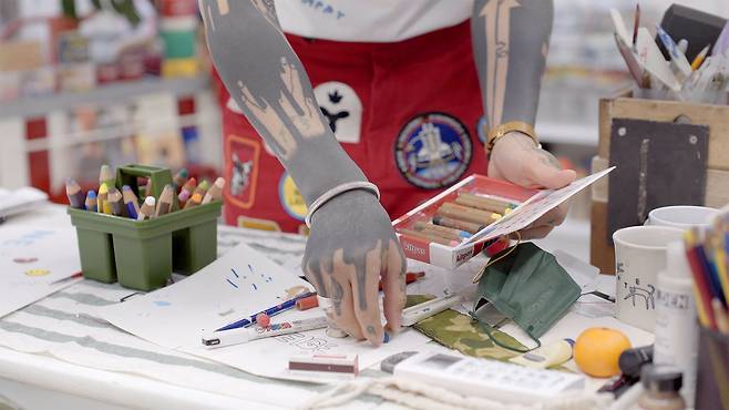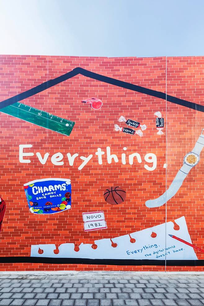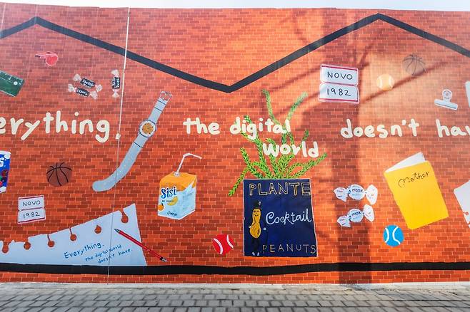 어린 시절을 성수동에서 보냈다는 노보 작가는 “성수동에는 큰 공장들이 많았지만, 그 골목 사이에서도 뭔가 아기자기한 사람의 온기가 느껴졌다”며 “아트월이 들어가는 부지는 학교 갈 때 매일 오가는 길이었기 때문에, 지금도 그 기억이 생생하다”고 밝혔다. 성수동 벽화 작업에 그려진 정물들을 보면 그 시절의 기억이 가득하다. 매일 친구들과 갖고 놀았던 농구공, 성수동의 수많은 의료 제조업 공장을 보며 품었던 패션 디자이너의 꿈, 이름표, 노트…. 성수동에서의 추억이 이번 작업에도 반영되었다는 게 재밌다. 성수에 아트월을 만들고 싶다는 의뢰를 받았을 때도 더없이 반가웠다고.
