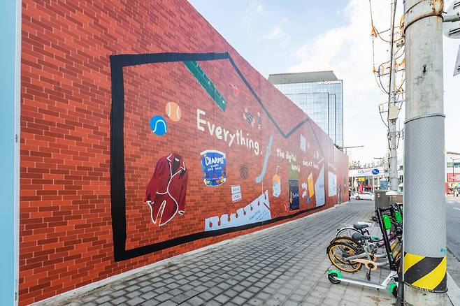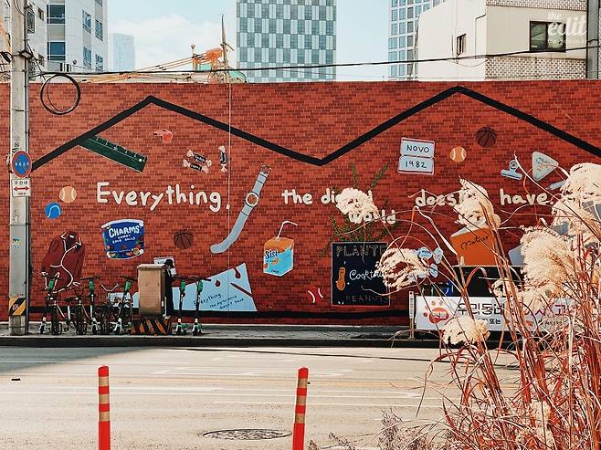 다음날 회사에 출근하니 에디터M이 스마트폰 사진 하나를 보여준다. “우리 집 앞에 이런 거 생겼다?” 사진 속에는 어젯밤 스치듯 봤던 벽화가 있었다. “여기 지금 공사 중인데 가림막에 그림 그린 건가 봐. 힙하지?” 그제야 사진 속 그림을 제대로 봤다. 견출지와 농구공, 손목시계, 씨씨 오렌지 주스, 쓰다만 노트까지… 누군가의 책상에서 꺼내온 것 같은 물건이 가득했다.
