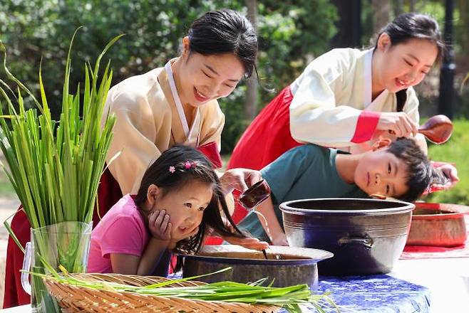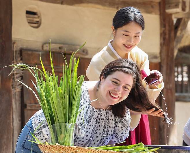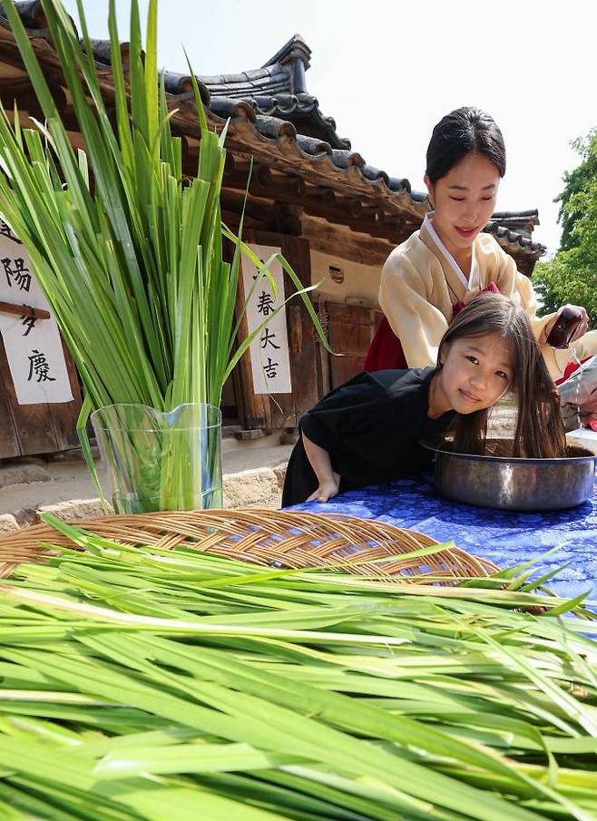 음력 5월 5일 전통 명절 단오를 맞아 2일 서울 종로구 국립민속박물관 내 오촌댁 앞에서 어린이들과 외국인이 단오를 맞이해 창포물에 머리 감기 체험을 하고 있다.