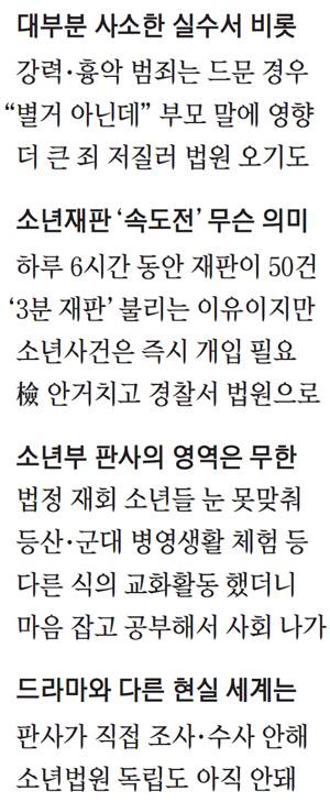 ▷국내 3300여 명의 판사 중 소년사건 담당 판사가 20여 명이다. 판사 1명당 1년에 1500~2000건의 소년사건을 다룬다. 재판은 일주일에 하루 50건 정도가 진행된다. 오전 10시~낮 12시, 오후 2~6시 총 6시간 동안 진행돼 평균 6분 만에 한 재판이 이뤄진다. 그래서 소년들 사이에서 '3분 재판'이란 말을 하기도 한다. 판사가 인적사항, 비행사항을 확인하고 변호인 역할을 하는 보조인과 소년범의 부모도 얘기하면 막상 소년이 얘기할 수 있는 시간이 1분도 채 안되는 경우가 많다.