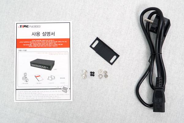 구성품은 스위치 허브 외에도 전원 코드와 사용 설명서, 그리고 고정용 브라켓과 브라켓 설치를 위한 나사가 동봉된다.