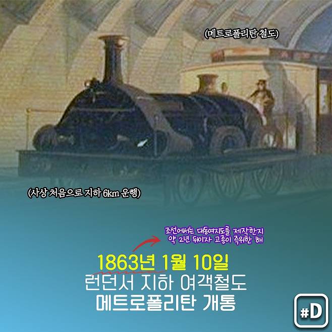 1863년 1월 10일은 영국 런던에서 세계 최초로 도시 지하 여객철도인 메트로폴리탄 철도가 개통됐습니다.