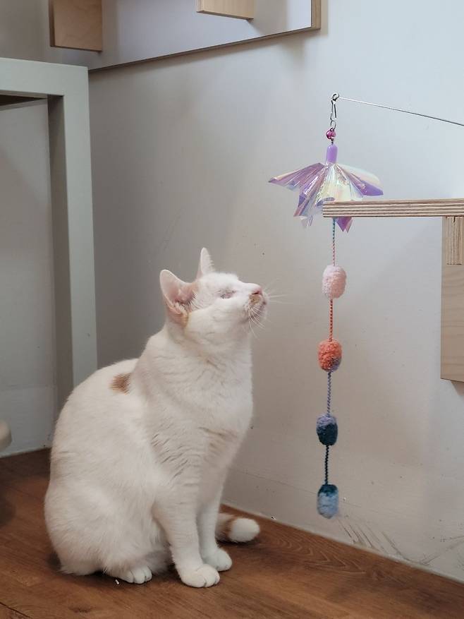 고양이는 수염을 통해 앞의 장애물을 파악하고 공간을 느끼는 등 앞이 보이지 않아도 감각을 통해 주변을 파악할 수 있습니다. 천천히 공간을 탐색하고 공간에 적응하는 시간이 조금 필요할 뿐입니다. 흰둥이와 피오나도 익숙하게 캣타워를 오르고 서로 잡기 놀이도 하며 활발한 생활을 이어가고 있습니다. 서로 투닥거리기도 하고, 캣타워 꼭대기에 올라 여유롭게 햇살을 즐기기도 하고요. 공간의 구성이 바뀌거나 처음 접하는 새로운 장난감이 생기더라도 흰둥이와 피오나는 조금의 탐색을 마치면 금세 새로운 것에 적응하곤 합니다.