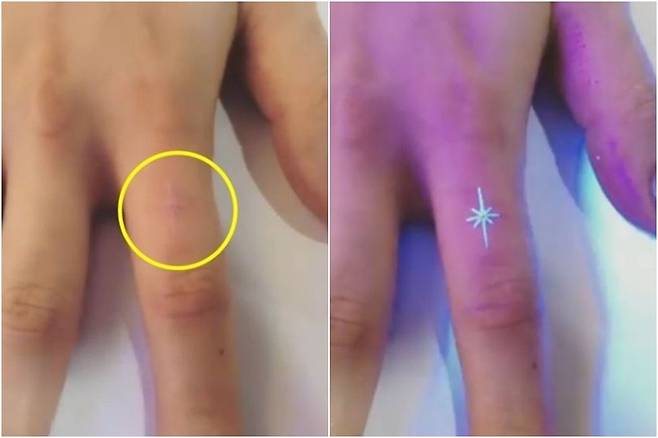 최근엔 아무것도 보이지 않지만 조명을 비추면 야광처럼 반짝이는 UV 타투를 손가락에 새겼다.