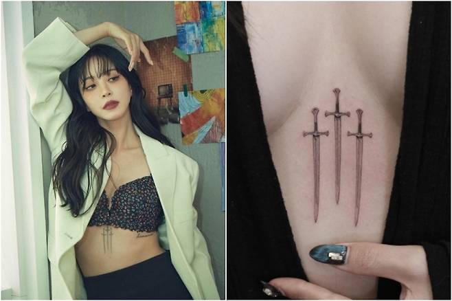 한예슬은 힘, 보호, 용기를 의미하는 칼 세 자루를 명치 부위에 새겼다.