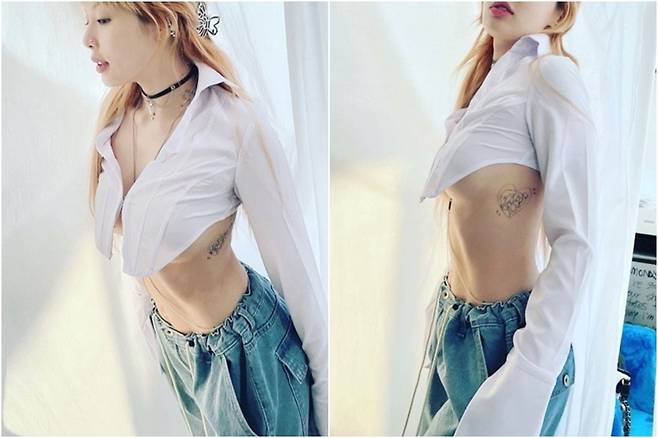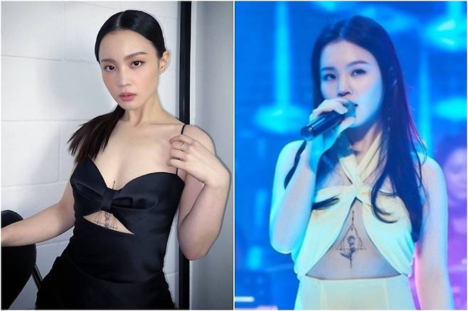 효린은 과거 2번의 개복 수술 후 배에 흉터가 생겨 십자가 모양의 타투를 했다고 털어놓은 바 있다.