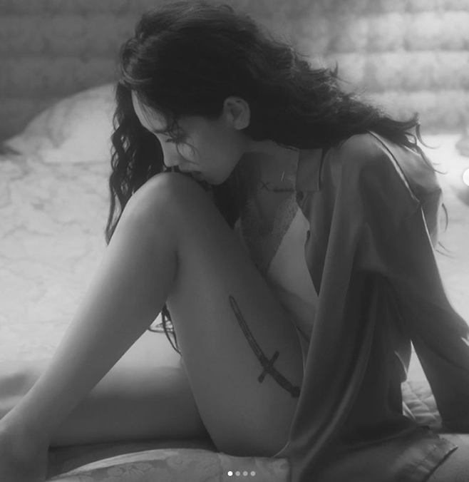 핫펠트(예은)는 허벅지에 기다란 칼 문양 타투를 했다.
