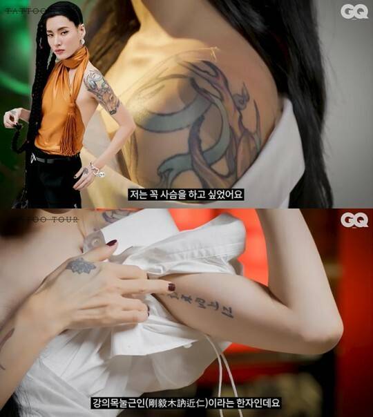 재갈을 물고 있어야 할 정도로 극강의 고통을 느낀다는 배, 쇄골 부위 타투도 심심찮게 볼 수 있다.