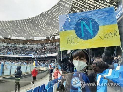 epa09835777 A young supporter shows a sign with a lettering reading 'No war' during the Italian Serie A soccer match between SSC Napoli and Udinese at 'Diego Armando Maradona' stadium in Naples, Italy, 19 March 2022. EPA/CIRO FUSCO