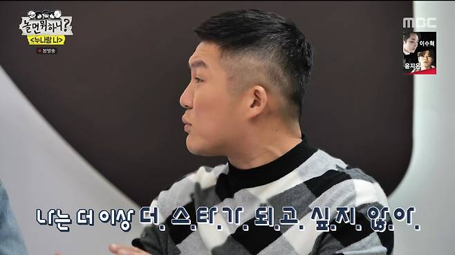 유재석은 지난 주에 이어 이경실, 박미선, 조혜련과 함께했다. 이날 네 사람은 '나만의 연예인'에 대해 이야기했다. 먼저 박미선은 배우 고수, 신화 에릭을 꼽았다. "얼마 전 '유퀴즈'에서 고수를 봤는데 완전 잘생겼다. 조각 같더라"는 유재석의 말에 박미선은 "고수 팬클럽 가입했었다. 작품 다 챙겨보면서 대사에 대답하기도 했다. 고수 결혼 청첩장을 받았는데 가슴이 무너져 내려서 못 가겠더라"고 밝혔다. 그러면서 "약간 고수가 이봉원과 비슷하지 않냐"고 말해 경악케 했다.