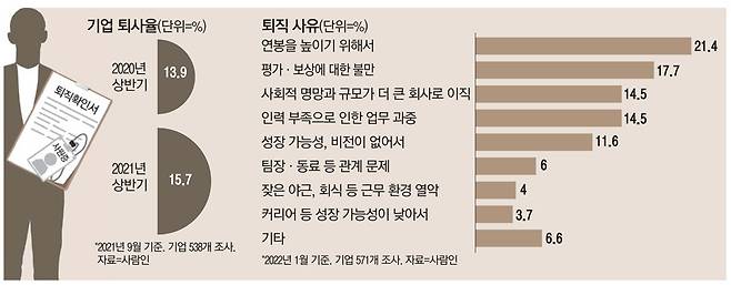 MZ세대를 중심으로 퇴사가 증가하는 것은 최근 통계에서도 확인된다. 취업 전문 플랫폼 '사람인'이 작년 9월 기업 538개를 대상으로 조사한 바에 따르면 지난해 상반기 퇴사율은 평균 15.7%로 2020년 동기(13.9%) 대비 1.8%포인트 증가했다. 올해 초 기업 571개를 대상으로 퇴직 이유를 조사했더니 '연봉을 높이기 위해서'가 21.4%, '평가·보상에 대한 불만'이 17.7%, '사회적 명망과 규모가 더 큰 회사로 이직'이 14.5%, '성장 가능성, 비전이 없어서'가 11.6% 등이었다.