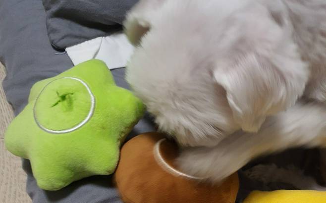 강아지 관심을 끌기도 좋고 입에 물 수도 있는 장난감, 간식을 주면 좋아. 강아지가 금세 정신이 팔려 보호자 발을 핥는 걸 멈추게 될 거야.