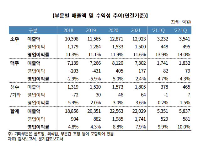 여기에 2분기에는 본격적으로 거리두기 제한이 해제되며 주점에서 소비도 활발해지던 시점이었다. 다만 파업으로 인해 주점 및 편의점에서 주류를 확보하는데 어려움이 발생하고 실제 주류업체들의 출고량도 대폭 감소해 일시적인 매출감소는 피할 수 없을 것으로 관측된다.