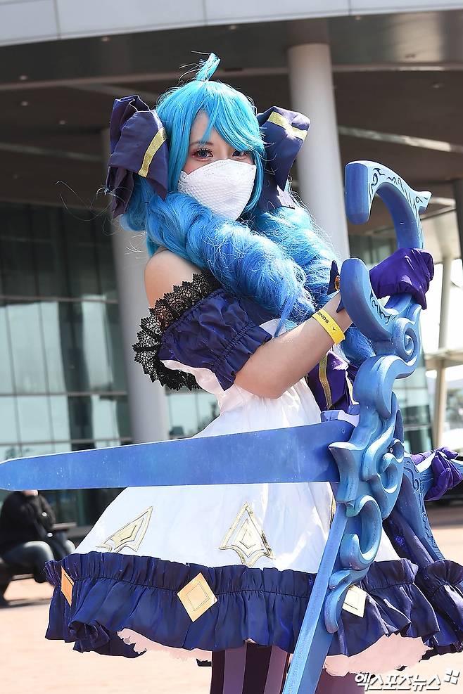(엑스포츠뉴스 고양, 박지영 기자) 2일 오후 경기도 고양시 킨텍스 제1전시장에서 열리는 '2022 리그 오브 레전드 챔피언스 코리아(LCK) 스프링' 결승전 T1과 젠지e스포츠의 경기에 앞서 LoL 챔피언 그웬 코스프레를 한 코스튬 플레이어 지니가 포즈를 취하고 있다.