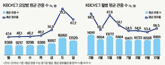 계절 영향도 무시할 수 없다. 개막 직후인 3월과 공휴일이 많은 5월 관중은 시즌 평균보다 20% 정도 많다. 이후 장마 기간과 혹서기가 겹치는 6~8월에 침체기를 겪고, 시즌 말미인 9~10월에 소폭 증가한다.