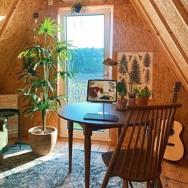 컨셉은 숲속의 작은 오두막이에요. 개인적으로 포근한 분위기를 가장 중요하게 생각했어요. 하루 중 가장 많은 시간을 보내는 곳이기도 하고, 무엇보다 마음이 편해야 작업도 잘 된다 생각하기 때문에 작업실의 분위기를 최대한 '따뜻하게 만들자!'라고 생각했던 것 같아요.