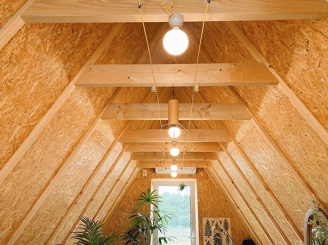 내부로 들어오면 작업실 천장은 삼각형 모양이에요. 독특하지요! 동그란 조명을 달아서 더 아늑한 분위기를 만들어주었습니다.