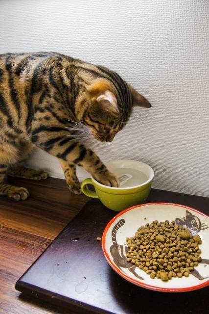 위생상의 이유로 야생의 고양잇과 동물은 죽은 사냥감 옆이 아닌 멀리 떨어진 곳에 있는 물을 마셨습니다. 또 물그릇이 벽에 붙어 있으면 시야가 좁아지기 때문에 불편함을 느낍니다.