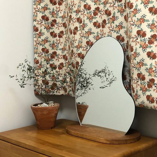 이 거울은 당근에서 우연히 보고 전철까지 타고 가서 직거래한 비정형 거울인데, 너무 잘 산 것 같아요. 옆에 제주도 가서 만들어온 화분도 소포라를 심었더니 찰떡이에요. 지금은 길거리에서 산 안개꽃이 자리를 대신하고 있답니다.
