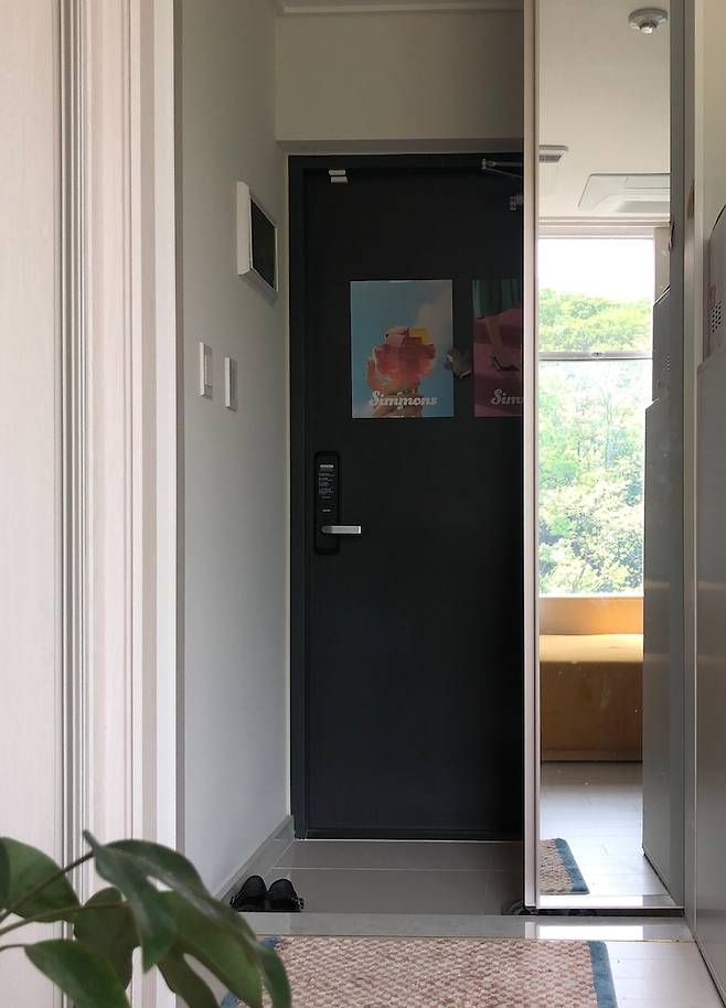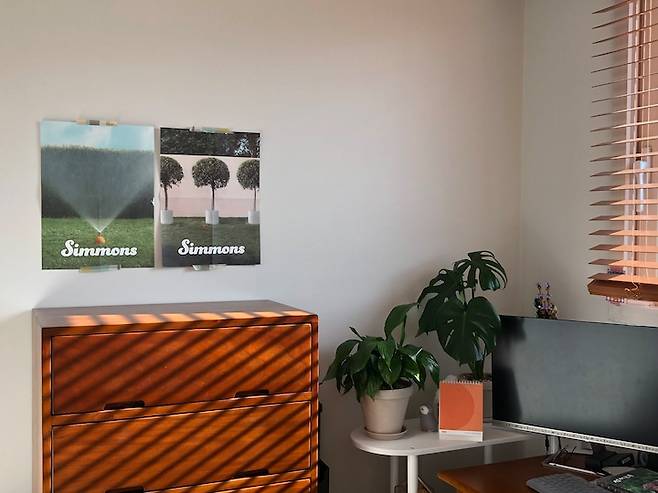 이 방도 해가 잘 들어와서 자기 전에 식물들이 해를 많이 보라고 블라인드를 올려주고 자요. 여기에도 시몬스 그로서리에서 받아온 다른 포스터를 붙여두었었어요. 시몬스가 포스터 맛집이네요.