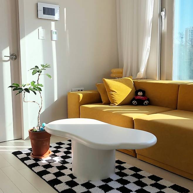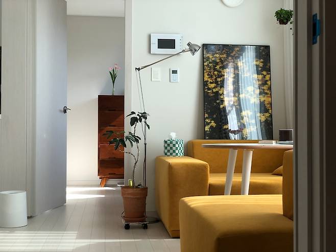 노란색 컬러감의 중심을 잡아주는 우리 집 소파에 관해 소개를 해볼게요. 저는 집이 작아 넓어 보이고 싶다는 이유로 소파를 흰색으로 하고 싶지는 않았어요. 이 집을 보자마자 '여기는 노란 소파가 들어와야 해'라고 (또) 강력하게 느꼈거든요. 결론적으로는 아주아주 대만족이에요.💛 집들이할 때마다 소파 칭찬을 많이 받았어요. 착석감도 좋고 예뻐서요🙂