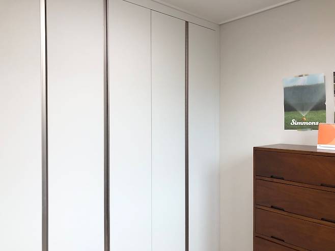 이 방은 붙박이가 있는 방이자 두 개밖에 없는 방 중 가장 큰 방이랍니다. 원래는 대부분 침실로 쓰실 방이죠. 근데 저는 옷장이랑 침대가 같이 있는 게 싫더라고요. 먼지도 많이 날 것 같고요. 그리고 저희 둘 다 집에서 일을 많이 하므로 큰 방을 재택근무를 하는 공간으로 내어주었어요. 드레스룸이자 사무실인 거죠.