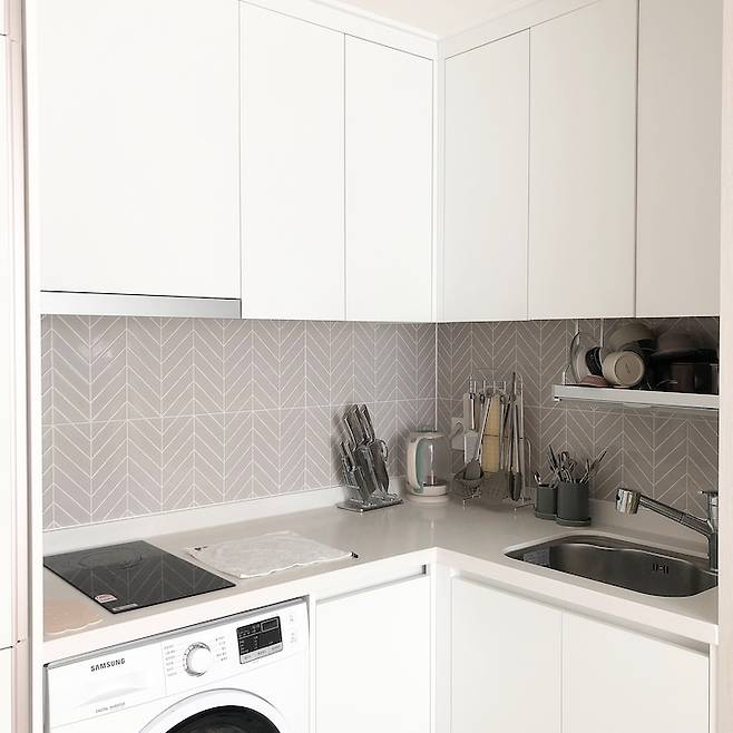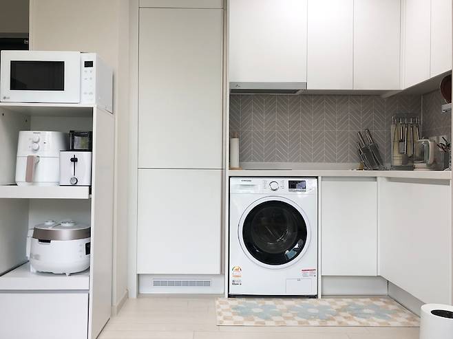 마지막으로 소개할 곳은 부엌이에요. 빌트인 냉장고와 세탁기는 기본옵션이었고, 왼쪽의 장은 따로 구매했어요. 전자레인지부터 밥솥까지 가득하죠. 이쪽이야말로 색상이 들어가면 집이 어지러울 것 같아 전부 흰색으로 맞췄어요. 가전에 큰 욕심은 없어서 흰색에 디자인만 적당하다면 구매했어요. 다 너무 잘 쓰고 있어서 잘 산 것 같아요.