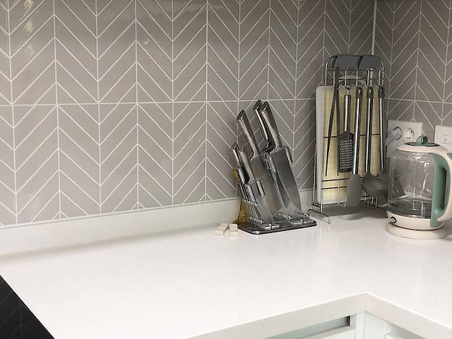 요리하는 공간은 양념장이나 여타 다른 물건들이 나와 있는 게 싫어서 전부 장에 집어넣어 버렸어요. 상판을 거의 다 쓰고 있어서 그런지 요리 공간이 작게 느껴지진 않더라고요.