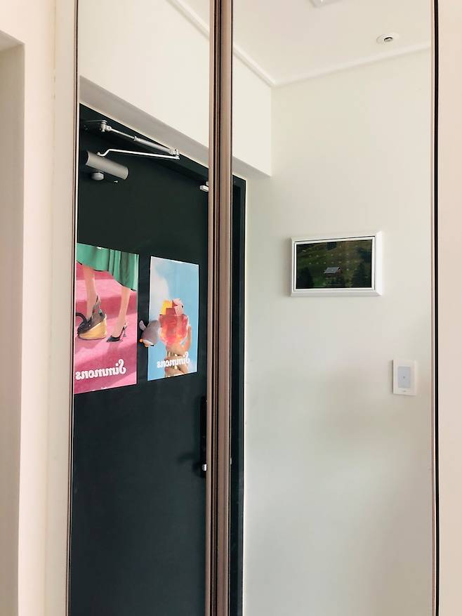 전신 거울을 둘까 하다가 필요할 땐 이렇게 거울을 펼쳐서 보곤 해요. 뒤에 비치는 산이 좋아서 거울을 보지 않을 때도 종종 펼쳐 놓아요.