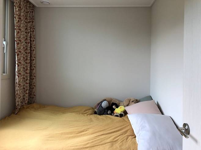 자, 이제 남은 하나의 방을 소개할게요. 여기는 침실이에요. 연애할 때 남편이 선물해줬던 저의 애착 인형들이 누워있네요. 제 로망이 방 안에 침대를 가득 넣는 거였는데, 원래는 침대가 커야 하거든요. 근데 여기는 방이 작아서 침대가 가득해졌어요. 어쨌든 로망 실현입니다. 너무 좋아 ~ 😊