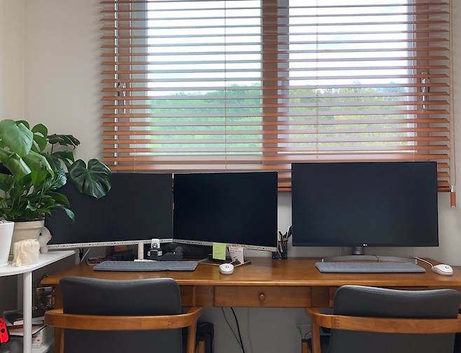 제 상상 속 이곳의 원래 컨셉은 “오두막”이었는데요, 지금은 그냥 “방”입니다. ㅎㅎ 일단 컴퓨터가 들어오는 순간 모든 컨셉은 망가지더라고요. 뭘 해도 그냥 컴퓨터 방~ 책상이 1800으로 상당히 큰 편인데도 모니터를 세 개 놓으니 여유 자리는 없더라고요. 오두막에 앉아 일기를 쓰려던 컨셉은 사라졌습니다.🙄