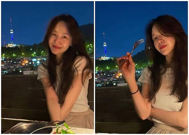 민아는 남산타워가 보이는 장소에서 식사 중이다. 카메라를 바라보며 싱그럽게 미소 짓는 민아의 미모가 러블리하다. 화장기가 거의 없는 민낯에도 빛나는 비주얼이 돋보인다.