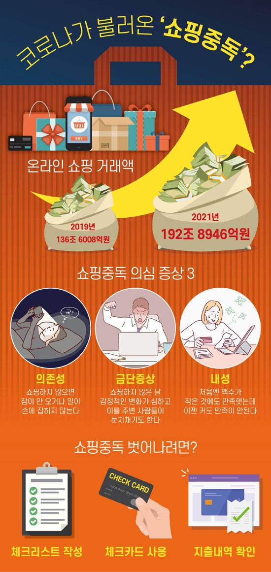 코로나19가 어떻게 쇼핑중독을 부를까요? 쇼핑중독의 원인은 스트레스일 가능성이 큽니다. 코로나19 이전엔 활동이 자유로워 다방면으로 스트레스를 풀 기회가 많았지만 그런 기회가 줄어든 지금은 쇼핑과 같은 순간적인 욕구 충족이 스트레스 해소 수단이 되는 겁니다. 외부에 나가지 않고도 온라인으로 언제 어디서나 쇼핑이 자유로워진 것도 쇼핑중독을 부르는 환경의 변화죠.