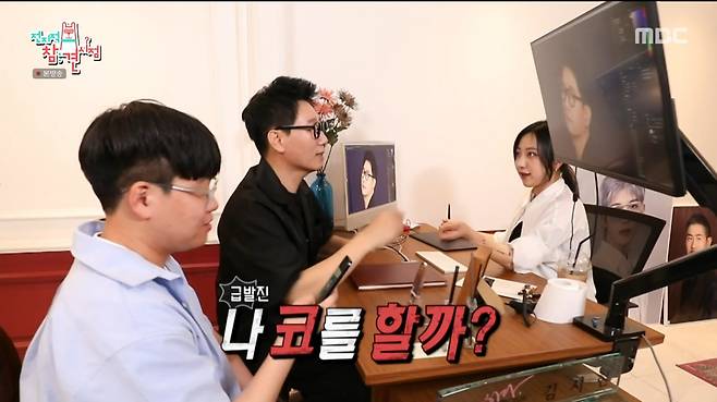 평소 '왕코'라는 애칭으로 불렸던 지석진은 "넓은 코를 뾰족하게 해달라. 콧 볼 좀 줄여 달라"고 요구했고, 사진 속 달리진 자신의 모습에 만족하며 "코 수술할까?"라고 매니저에게 묻기도 했다.