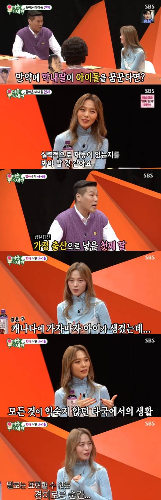 신동엽은 "첫째 아이를 집에서 낳고 품에 처음 안았을 때 기분이 어땠냐"라며 질문했고, 선예는 "(어머니들은) 경험해 보셔서 아시겠지만 말로 표현할 수 없는 고통에서 갑자기 생명이 내 눈앞에 보이는 이게. 와. 말로 표현할 수 없는. 경이로운 순간. '이게 생명이구나'라고 하니까 가슴이 벅찼다"라며 감격했다.