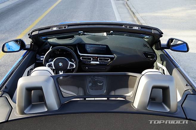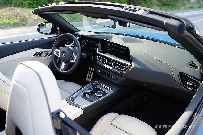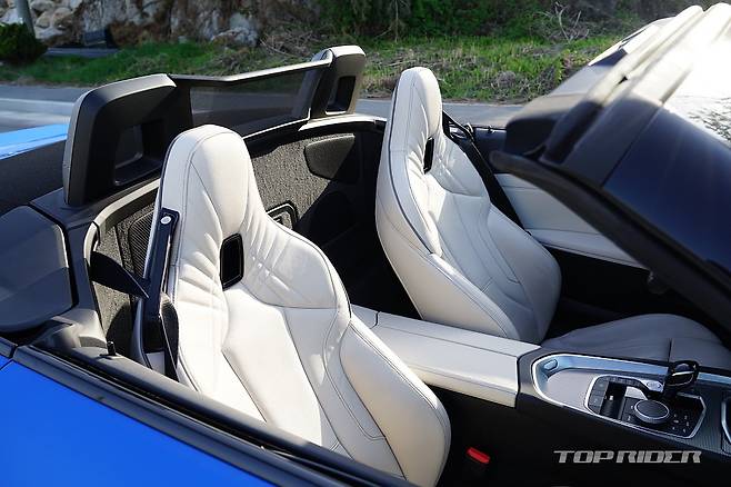 Z4의 시트포지션은 스포츠카답게 아주 낮은 위치까지 지원한다. 두툼하고 감촉이 좋은 스티어링 휠과 부드럽지만 좌우 지지력이 좋은 버네스카 가죽시트는 등쪽 쿠셔닝이 뛰어나다. 지면과 가까운 시트포지션과 시트 바로 뒤에서 들리는 휠하우스 돌 튀는 소리는 반갑다.