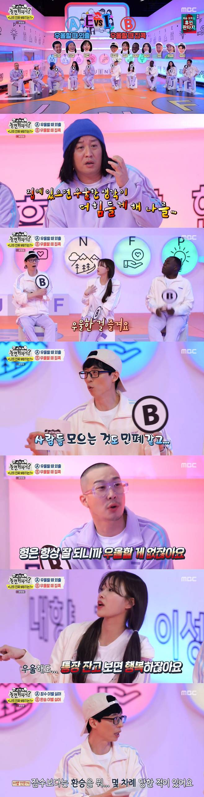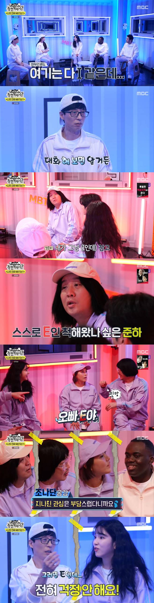19일 방송된 MBC '놀면 뭐하니?'에서는 I(내향형) 유재석-이미주-이선빈-이말년-조나단, E(외향형) 정준하-하하-신봉선-이이경-진예(라붐)로 팀이 나뉜 가운데, MBTI가 뒤바뀐 참가자를 찾기 위한 다양한 토크, 게임을 펼쳤다.