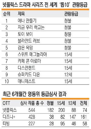 15일 만에 세계 1위 자리를 내준 K-콘텐츠 ‘지금 우리 학교는’(2위)을 비롯해 1위 ‘애나 만들기’, 5위 ‘검은 욕망’ 등이 모두 ‘18금’이었다. 좀비가 소재인 ‘지금 우리 학교는’은 7개 심사 항목 중 폭력성, 공포, 대사 등 5가지에서 ‘18금’ 판정을 받았다. ‘애나 만들기’는 대사에서, ‘검은 욕망’은 선정성·폭력성 등에서 ‘청불’ 수위로 판정됐다. ‘청불’ 작품이 대세이다 보니 작품의 수위에 대한 판단 감각도 무뎌지는 듯했다.