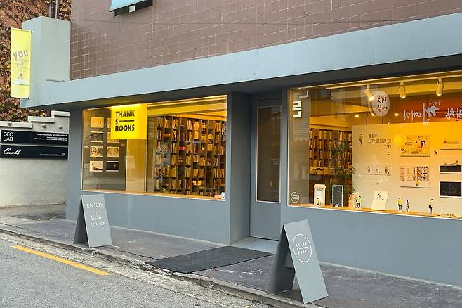 땡스북스는 큐레이션 서점인데요. 스태프들이 선호하는 책들을 선별하여 소개하며, 다양한 주제의 도서를 큐레이션 하는 것이 특징인 독립 서점입니다. 점심부터 저녁 늦게까지 운영하여 얌전한 홍대 놀거리로도 손색이 없죠. 입구에 들어서면 매번 바뀌는 진열대 구성이나 작가님들의 굿즈들은 더욱 신선하게 느껴집니다.