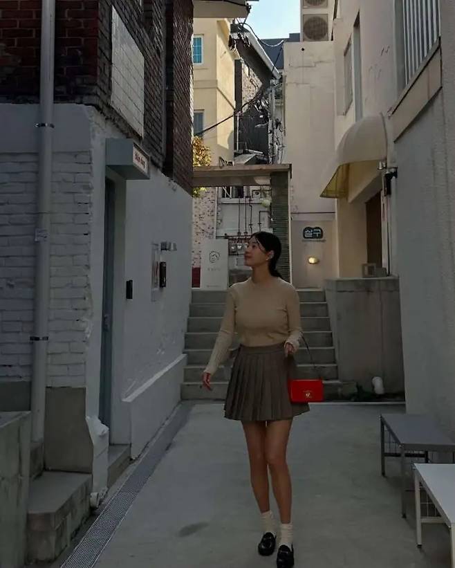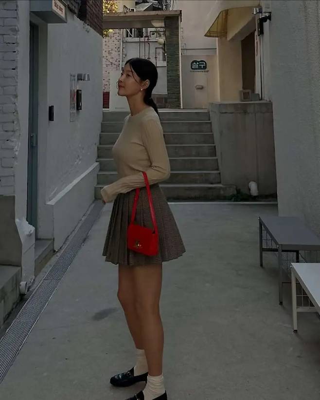 여기에 흰 양말과 로퍼를 함께 신어 다리가 길어 보이며, 붉은 미니백을 더해 색의 포인트를 줬다. 니트는 몸에 맞게 떨어지고, 스커트는 주름이 풍성해 전체 밸런스가 자연스럽다.