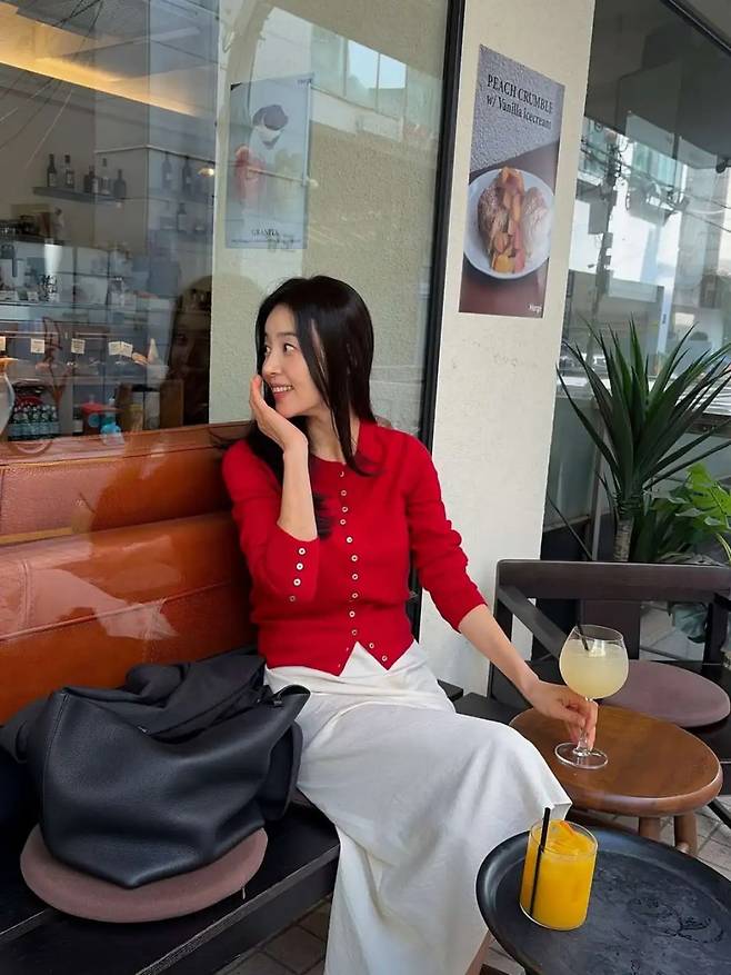 레드 카디건으로 완성한 깔끔한 포인트룩