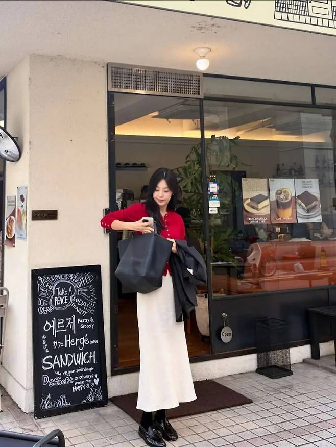 첫 번째는 레드 카디건과 아이보리 롱스커트 스타일이다. 레드 카디건은 얼굴빛을 환하게 하고 시선을 위쪽으로 끌어올리는 효과가 있다. 니트 특유의 짜임이 몸에 알맞게 밀착돼 안정적인 실루엣을 만든다.