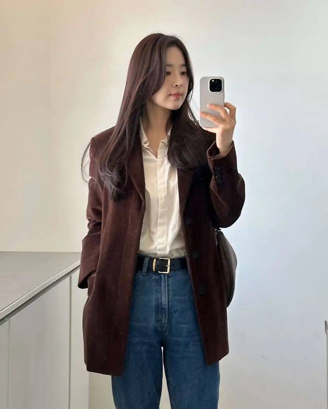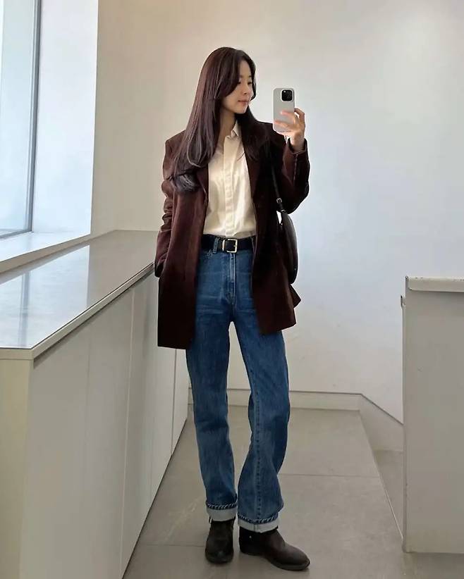 두 번째는 브라운 재킷과 데님 팬츠 스타일이다. 짙은 브라운 코듀로이 재킷이 계절감을 높여주고, 안쪽 아이보리 셔츠가 전체적인 톤을 안정시킨다. 셔츠를 팬츠 안으로 넣고 블랙 벨트로 중심을 잡아 허리선을 또렷하게 했다.