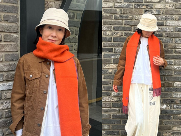 여기에 나영희는 브라운 톤의 데님 재킷을 매치해 차분한 가을 분위기를 더했으며, 생동감 있는 오렌지색 머플러로 포인트를 주어 전체적인 스타일에 활기를 불어넣었습니다.