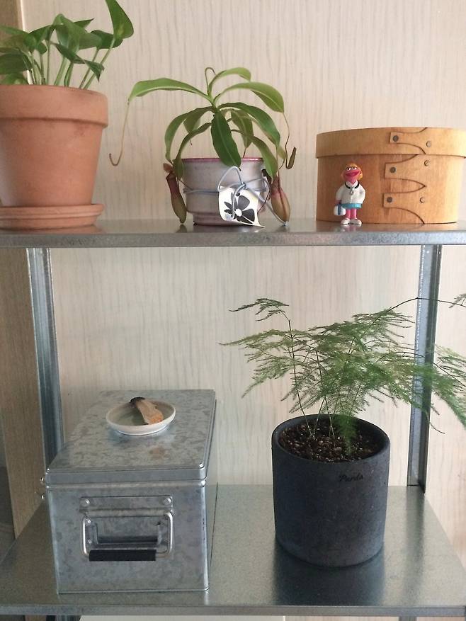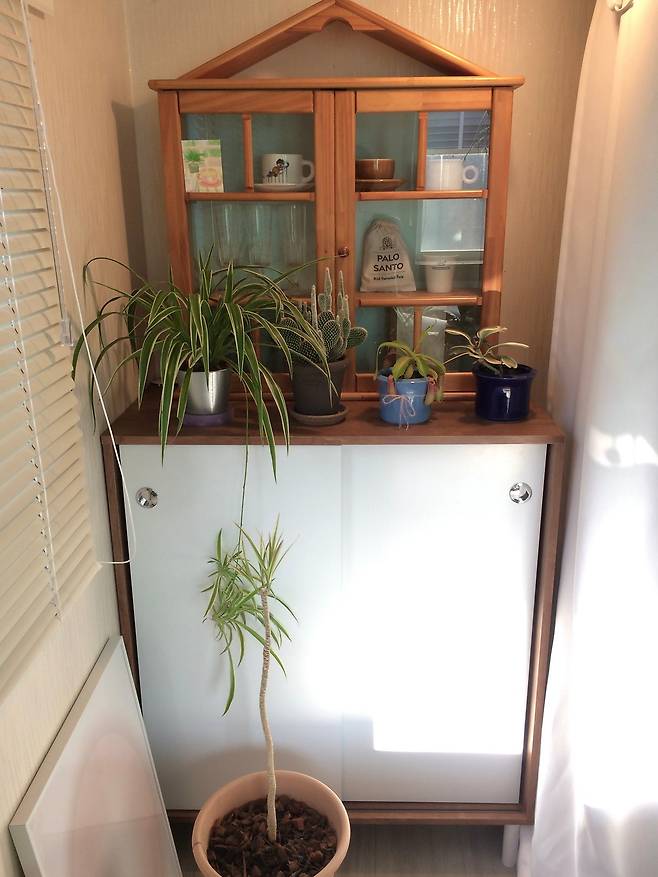 침대 앞에는 수납장을 두어 옷과 여러 잡동사니를 보관해 주었어요. 슬라이딩 도어라서 문을 여닫을 때 공간을 많이 차지하지 않아 좋아요. 수납장 위엔 주로 화분을 올려두고 있어요. 대신 햇빛이 잘 들어오지 않는 곳이라 따로 식물등을 설치해 주었습니다. 수납장 위에는 빈티지 선반장을 두어 찻잔 등을 보관하고 있어요.